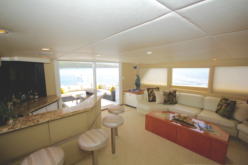 The saloon is adjoined to the formal dining area midship, which can comfortably seat up to ten guests. This area also has custom granite counter tops. Refrigerator, ice maker and Bar stool seating for two.