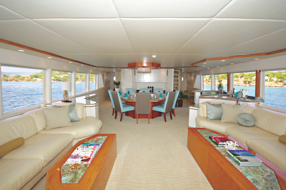The saloon is adjoined to the formal dining area midship, which can comfortably seat up to ten guests. This area also has custom granite counter tops. Refrigerator, ice maker and Bar stool seating for two.