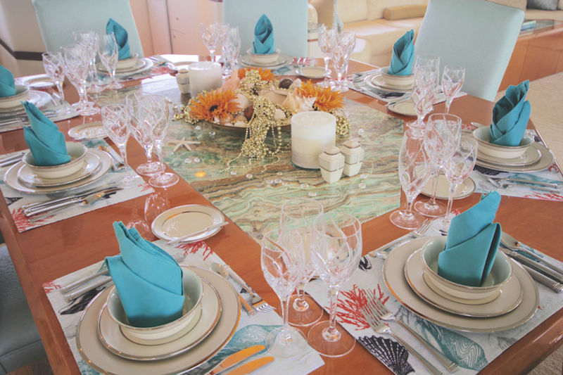 The saloon is adjoined to the formal dining area midship, which can comfortably seat up to ten guests. This area also has custom granite counter tops. Refrigerator, ice maker and Bar stool seating for two.