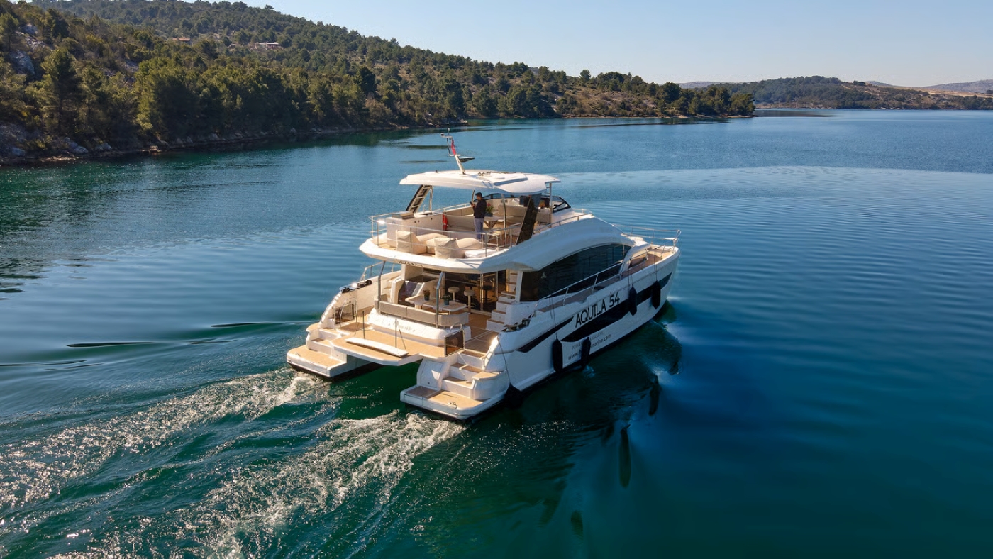 The king-sized master cabin boasts a walk around bed and panoramic windows.