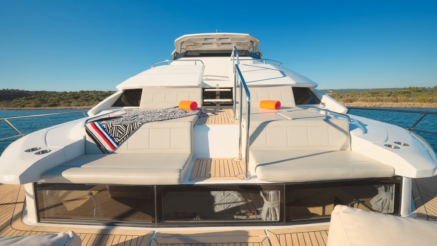 The main deck aft cockpit offers bench seating, a flexible table and other moveable chairs to create a sheltered dining setting.