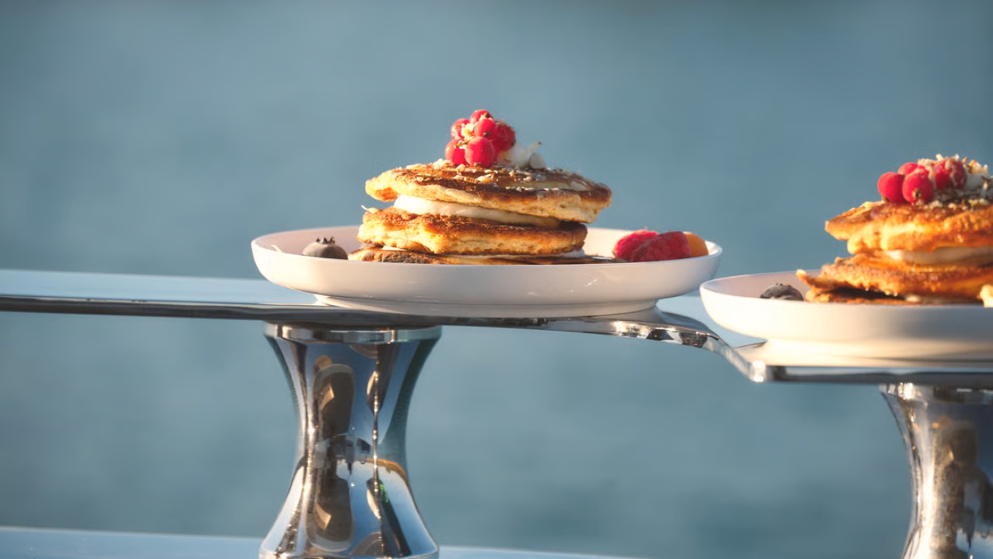 The flybridge sky lounge merges the wheelhouse with a seating and table area for guests and is climate controlled with captain and companion seating up front.
