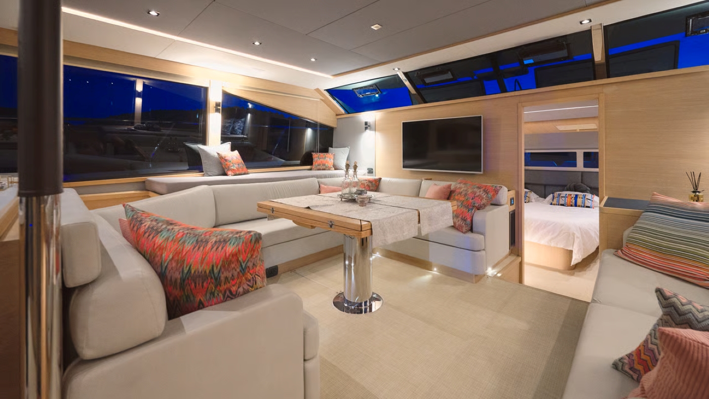 The main deck aft cockpit offers bench seating, a flexible table and other moveable chairs to create a sheltered dining setting.
