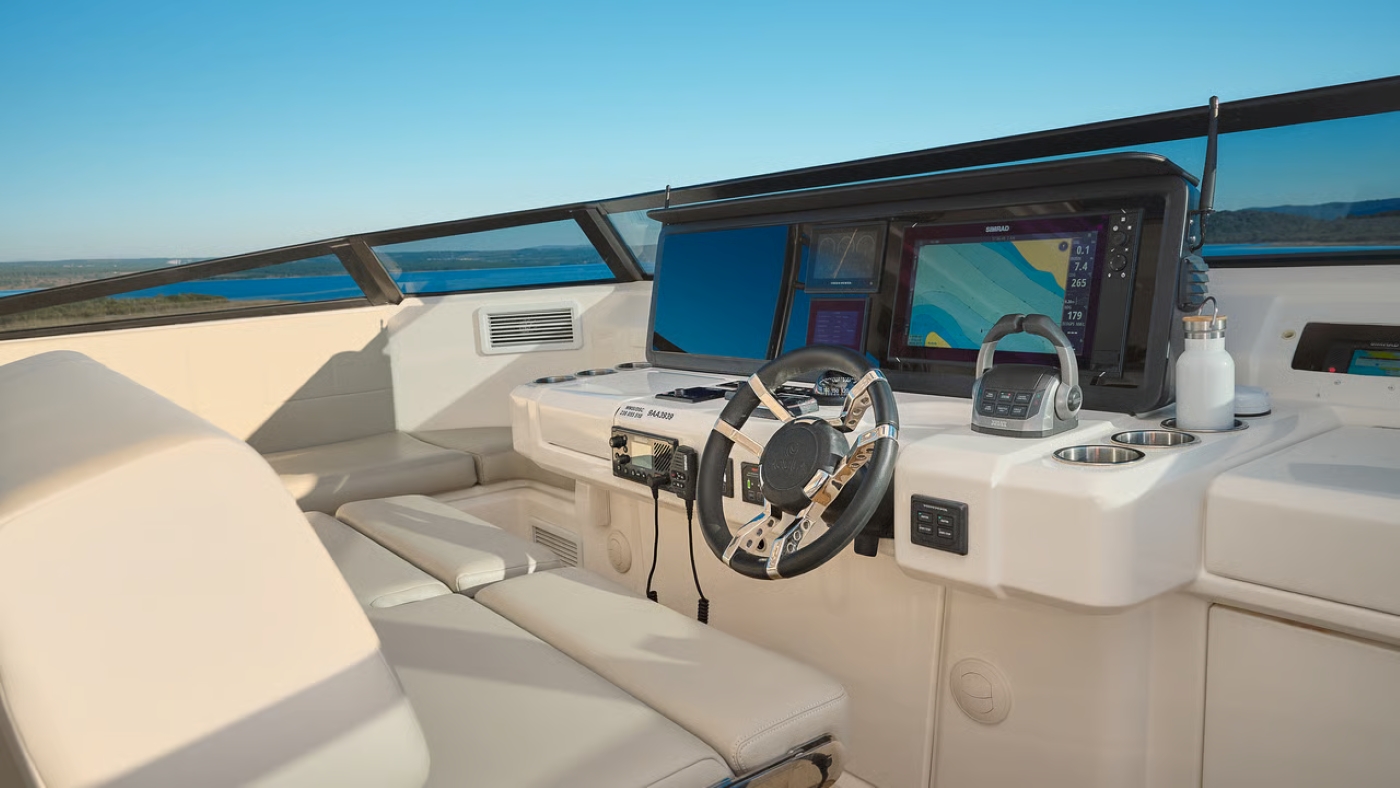 The king-sized master cabin boasts a walk around bed and panoramic windows. Steps lead down to the ensuite on the starboard side which benefits from twin vanity, a separate head and shower. Steps down on the port side lead to a ...