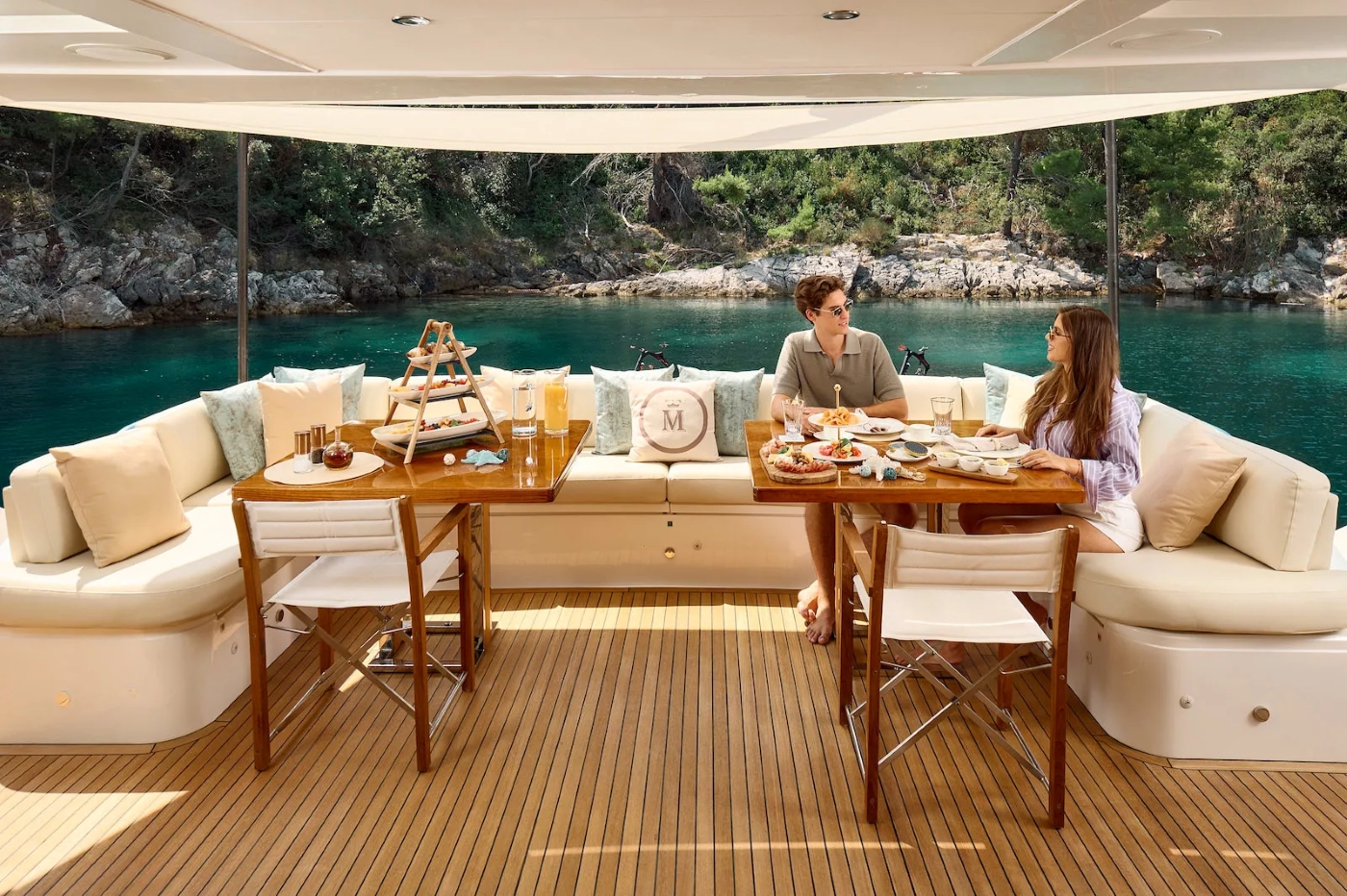 The upper deck is dedicated to outdoor dining and offers a large oval dining table for up to twelve guests and an aft lounge with a bench sofa tucked into the bulwarks. The foredeck is perfect for sunbathing on the adjustable built-in sun pads and relaxing on the sofas and enjoying the views over the bow.