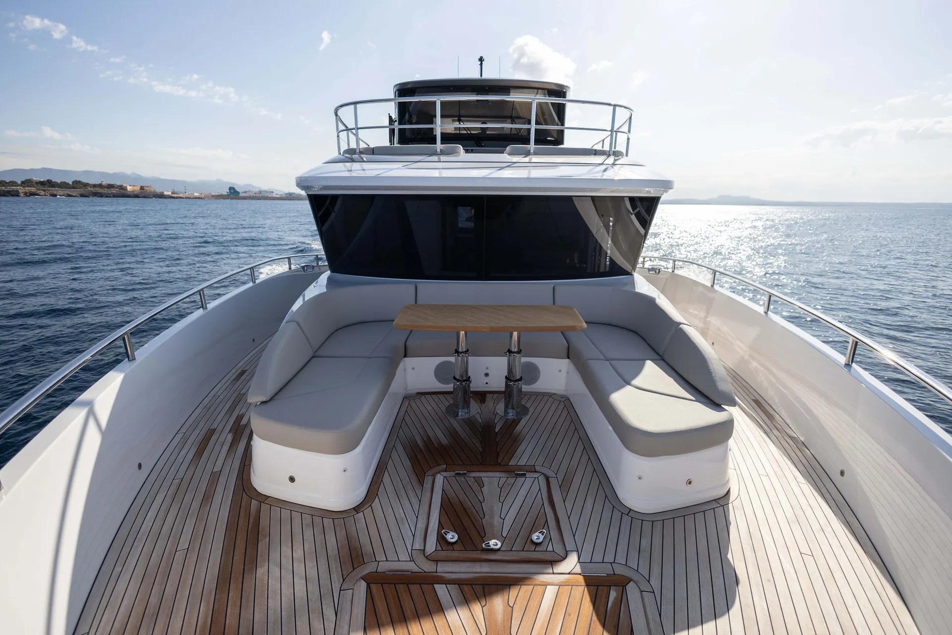 The main deck aft is dedicated to al fresco dining where sofa seating and moveable chairs surround an adjustable table. Sheltered under the flybridge overhang, the area is beautifully shaded – perfect for meals during the day and evening.