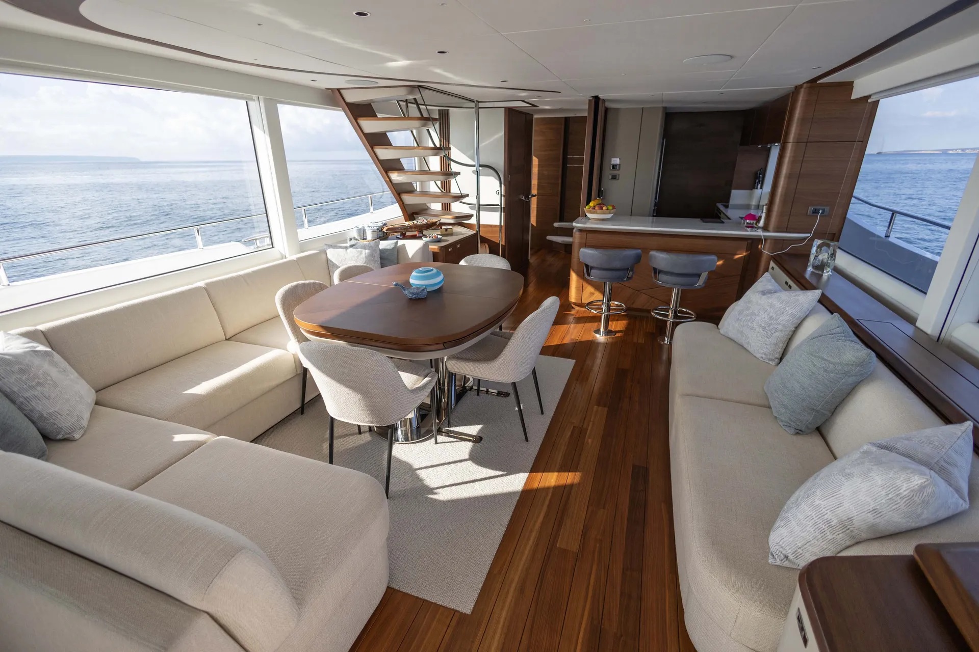 The unique layout of this model places one of the guest cabins forward on the main deck and there is both a sky lounge and main salon, creating plenty of guest space. Three crew members are on board throughout charters to look after the guests.