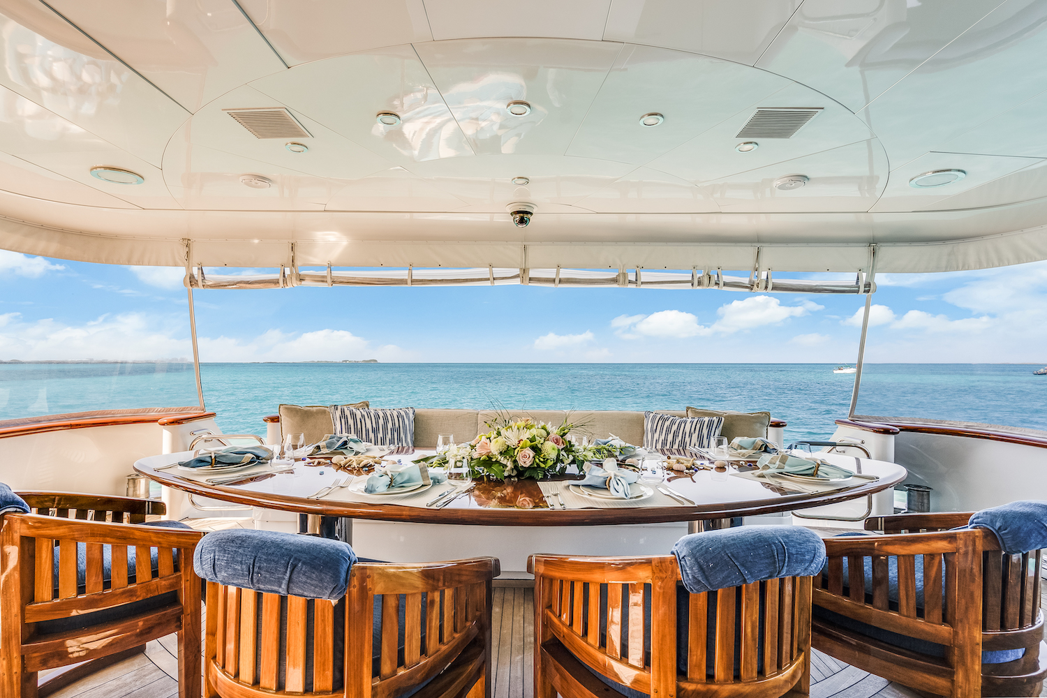 Aft, a games table continues onto comfortable lounges with entertainment facilities and further into the dining area which is separated only by cabinetry. The open-style salon creates an ambience of openness and freedom inside as natural lights also flood the room through large windows along each length of the hull.