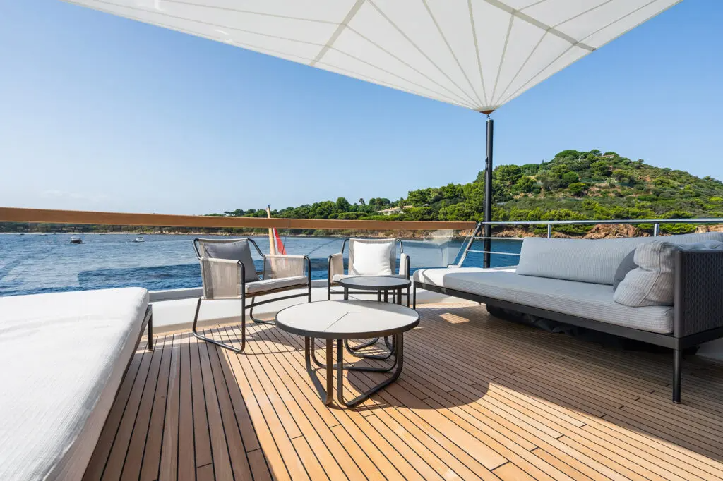 The sun deck is a sociable space with a comfortable corner dining setting under the hard roof and an open lounge to aft.