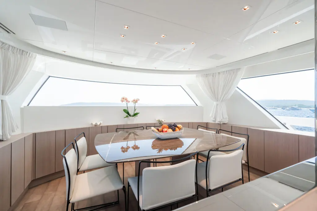 The sun deck is a sociable space with a comfortable corner dining setting under the hard roof and an open lounge to aft.