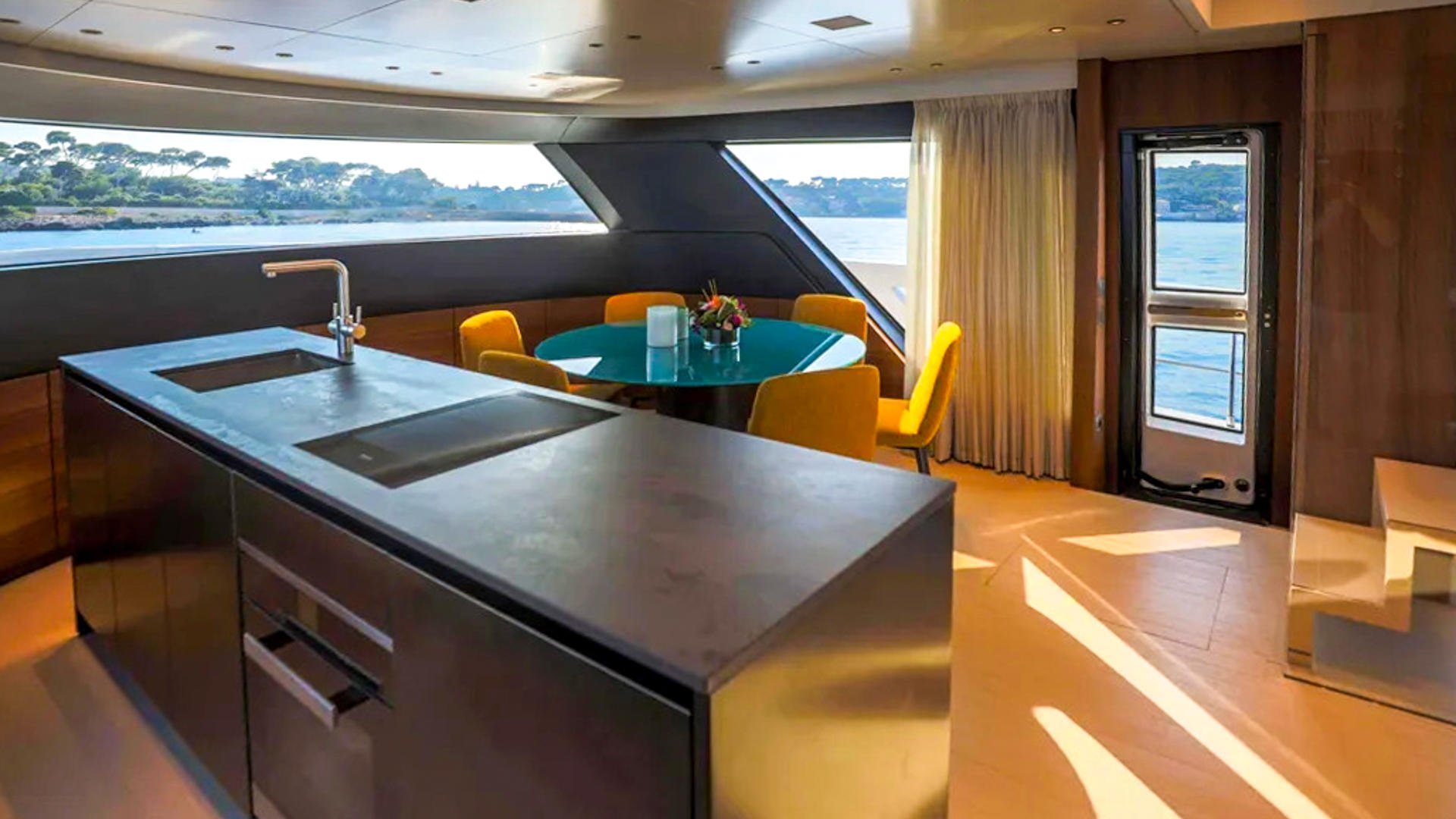 The expansive main cockpit extends further onto the swim platform making a huge deck space near the water’s edge.