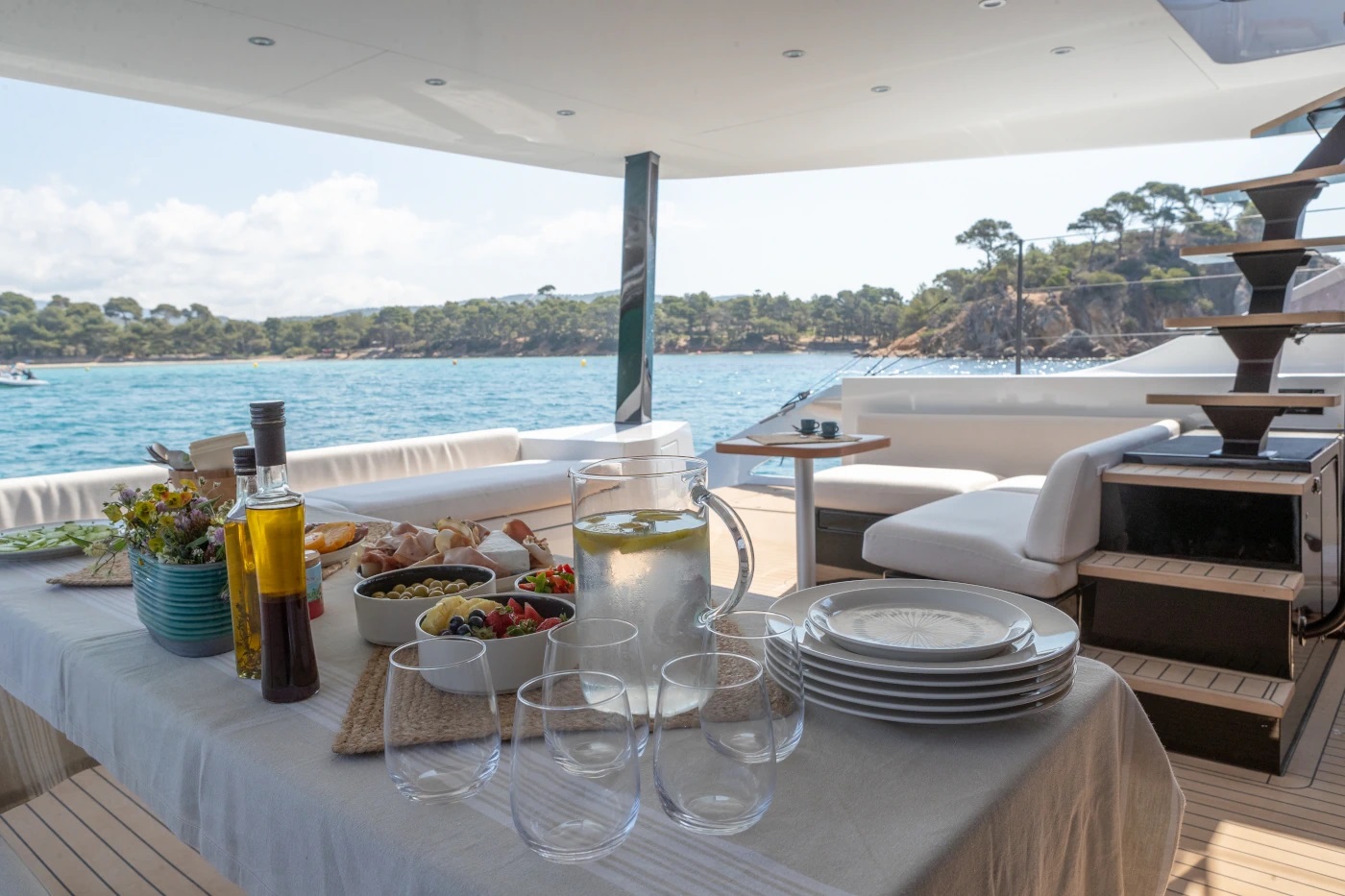 The sundeck offers open vistas and a flexible arrangement of modular seating which can be set up for dining, sunbathing or relaxing with a drink and watching the world go by. The helm controls are forward and there are port side steps down to the main deck.