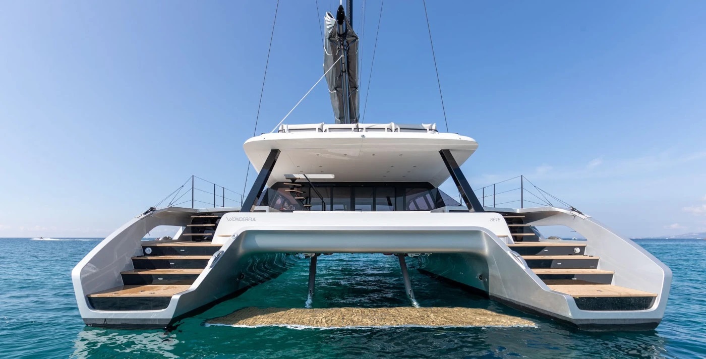Steps lead down on either side to the water’s edge and the central hydraulic swim platform. The foredeck has two trampoline nets which guest can lie on to sunbathe with the cool water beneath them.