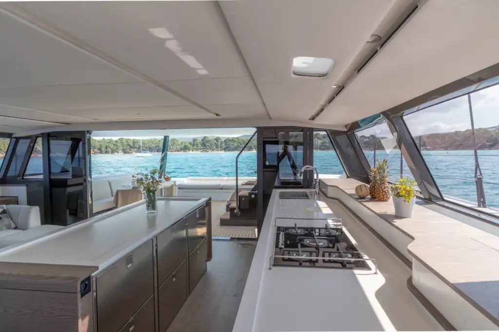 The open plan main salon is filled with light thanks to the panoramic windows on three sides and sliding doors onto the aft deck. The salon includes an integrated galley and when the doors are open becomes one huge entertainment space combined with the aft cockpit.
