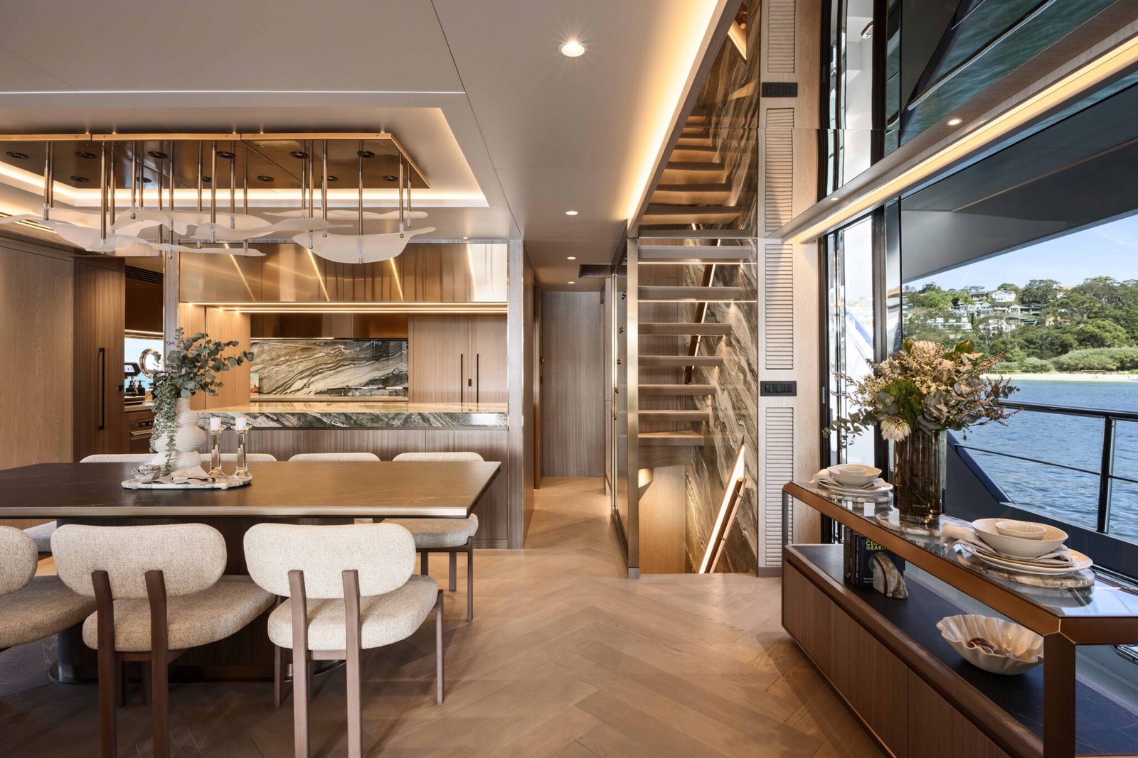 On the main deck aft there is a sheltered al fresco dining area covered by the flybridge overhang and steps down to the water’s edge swim platform which is large enough to be set up with chairs or sun loungers.