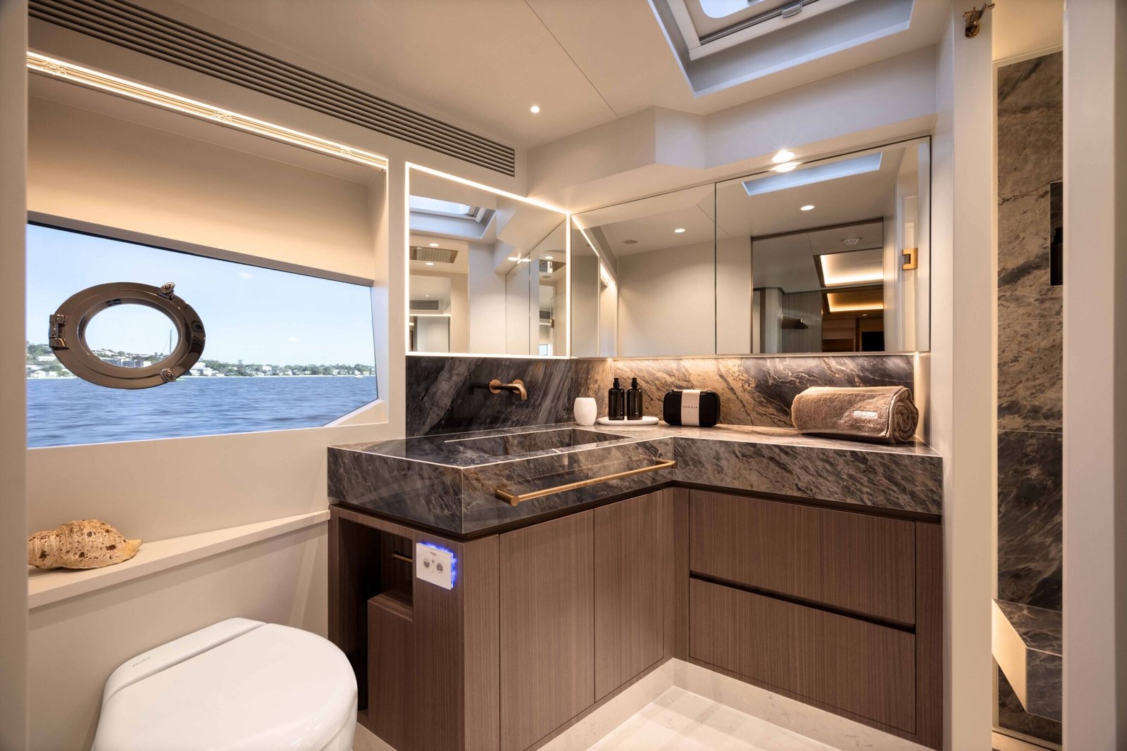 The main deck master features a super king-sized bed, his and hers ensuites with central rainfall shower, two walk in wardrobes and huge windows filling the space with natural light. On the lower deck are four ensuite cabins – two queens and two queen/twin convertibles.
