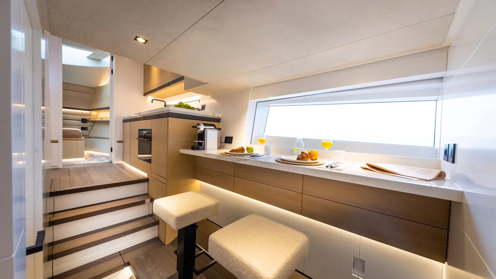 The galley and guest area on the lower deck are stylish and sleek and leads to the three guest suites.