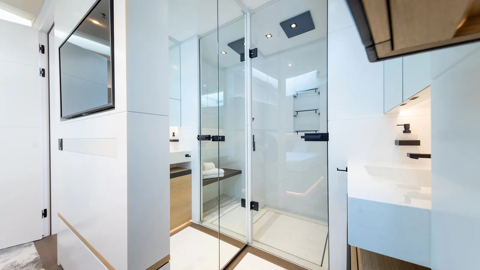 There are three guest suites configured as an amidships master with seating area and ensuite and a forward VIP and bunk cabin each with ensuite shower facilities. There is a convenient day head on the lower deck.