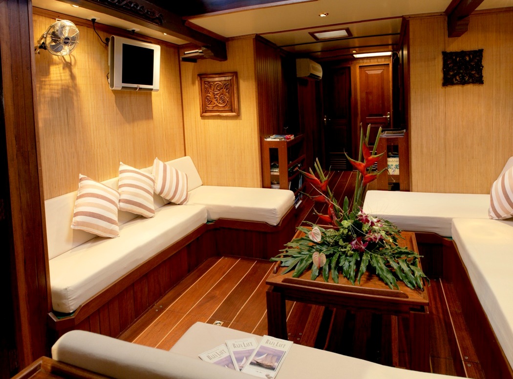 The below deck lounge area is equipped with TV and music systems. Above deck, there is spacious dining and sunbeds on which you can relax and what the scenic world drift by. Raja Laut comes with a professional European and Thai crew of 6 including a skipper, cook, hostess, deckhand and a fully qualified dive instructor.