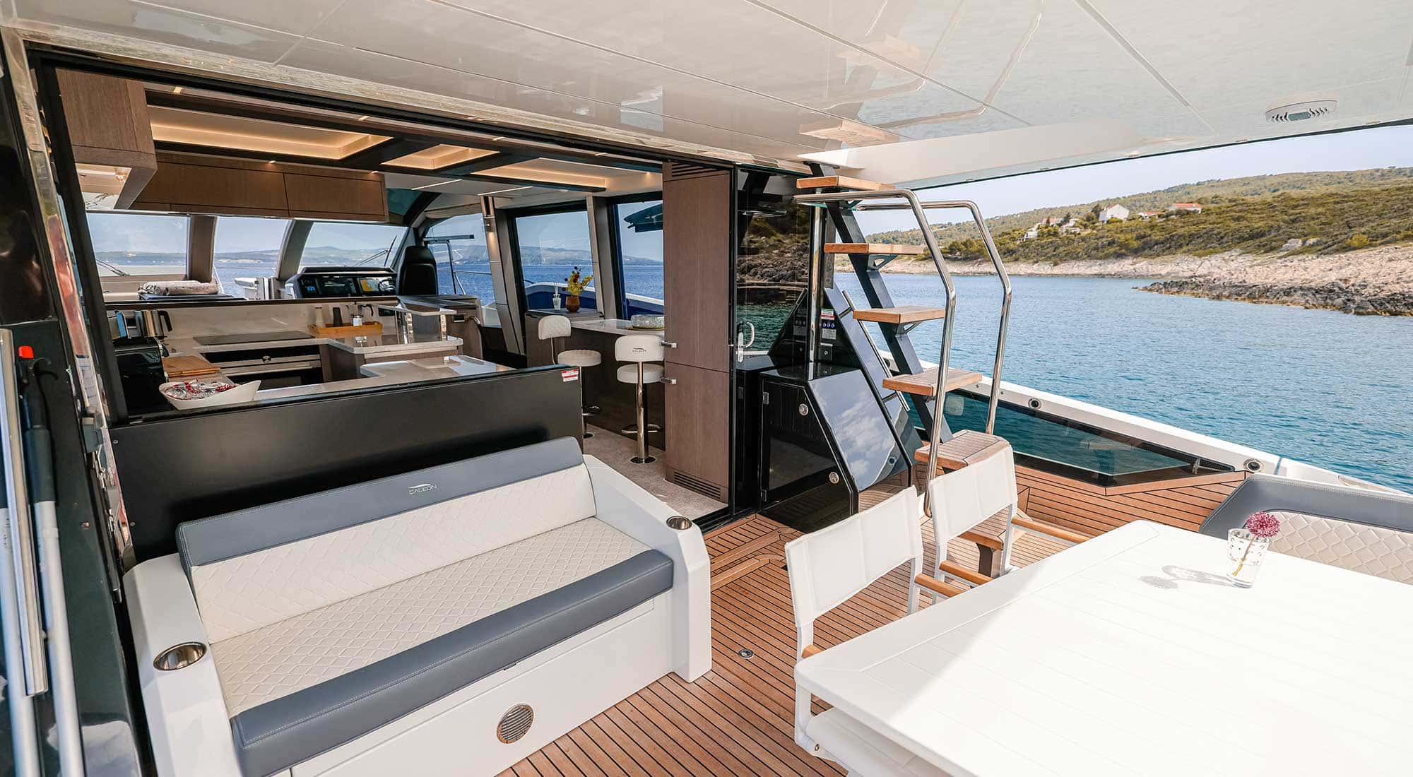 Across the main deck and flybridge the yacht’s spaces are well-configured to optimise al fresco living.