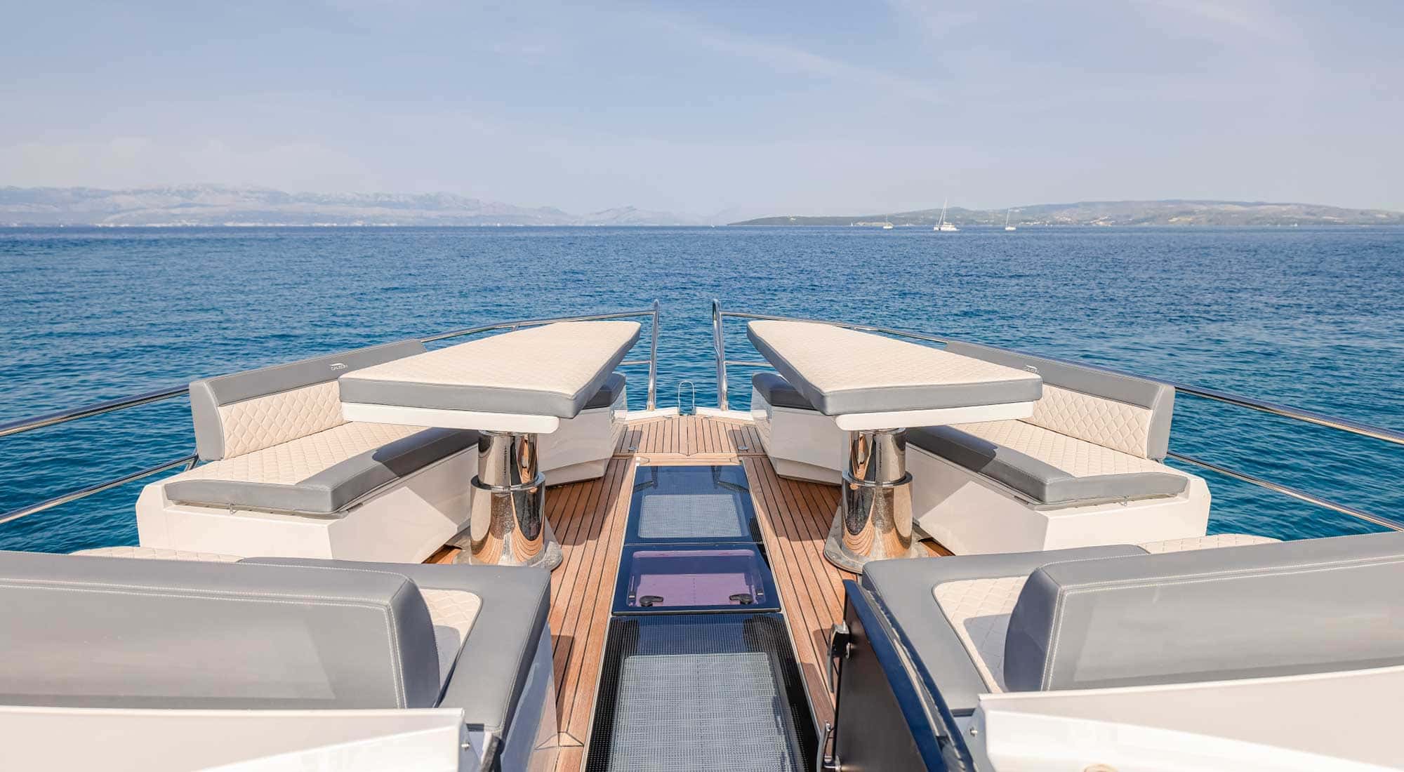 On the foredeck an arrangement of sun pads and day beds create a comfortable spot for sunbathing. There is a convenient door leading from the foredeck into the main salon and aft doors leading from the salon to the cockpit.