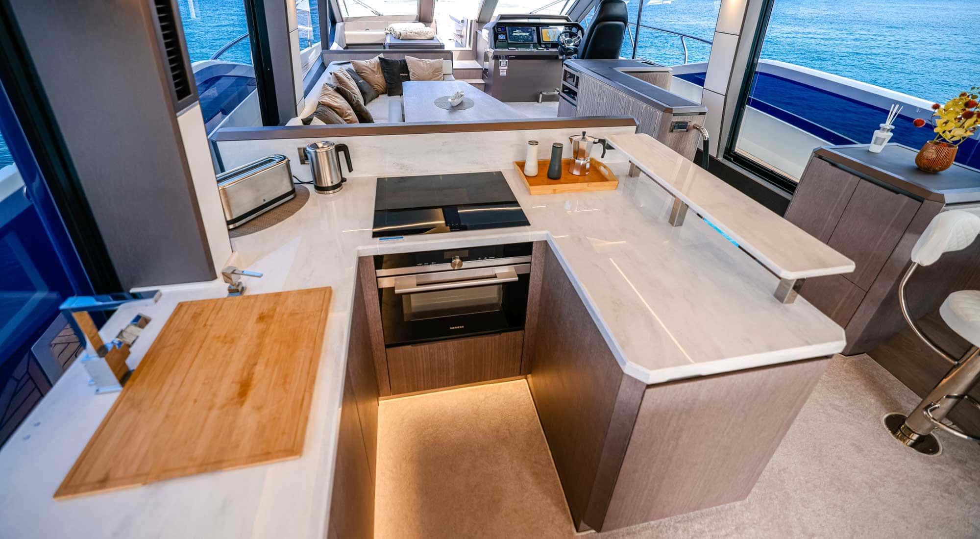 The main salon is light and spacious and includes an integrated galley creating a wonderful family layout.
