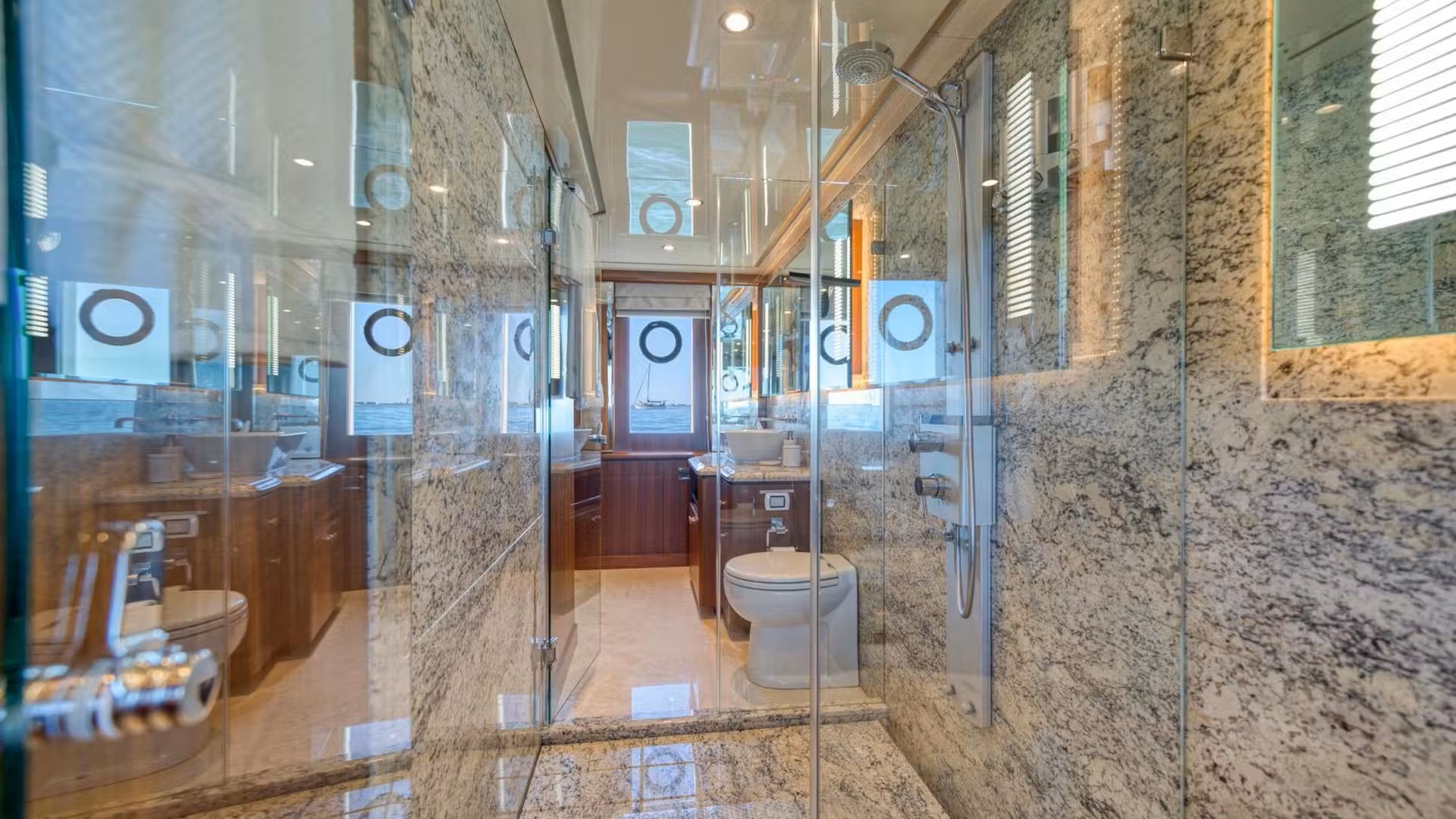 The master suite benefits from his-and-hers ensuites with a central rainwater shower, two walk-in-closets and a seating area. The VIP is forward and includes an ensuite, a walk-around bed and plenty of storage, while the two amidships twins are also ensuite.