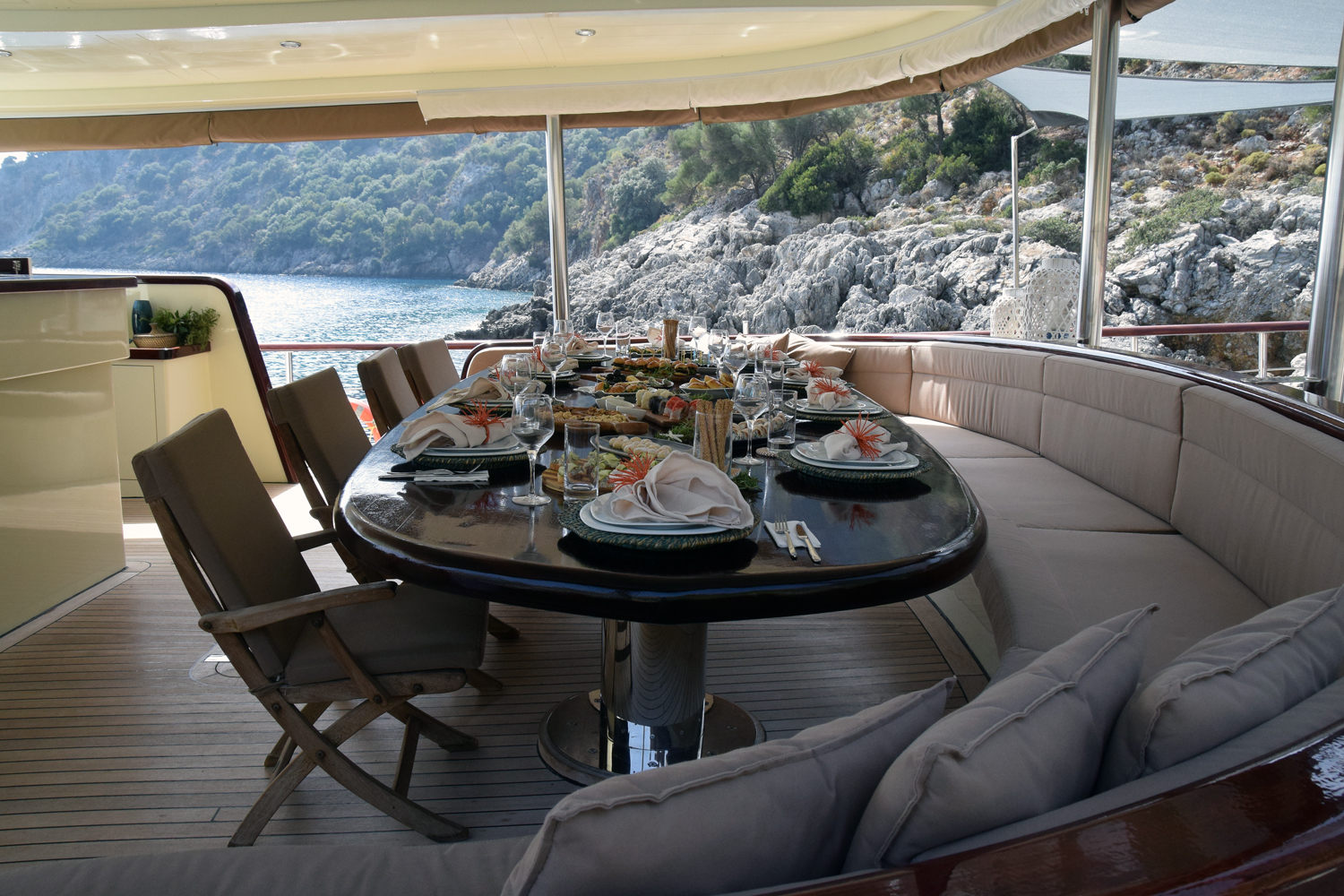 The aft cockpit boasts a hard roof covering the dining setting which offers bench seating, other moveable chairs and a flexible table. The bar and helm controls are also under the hard roof and a canopy can be raised if required to shade the aft sun pads.