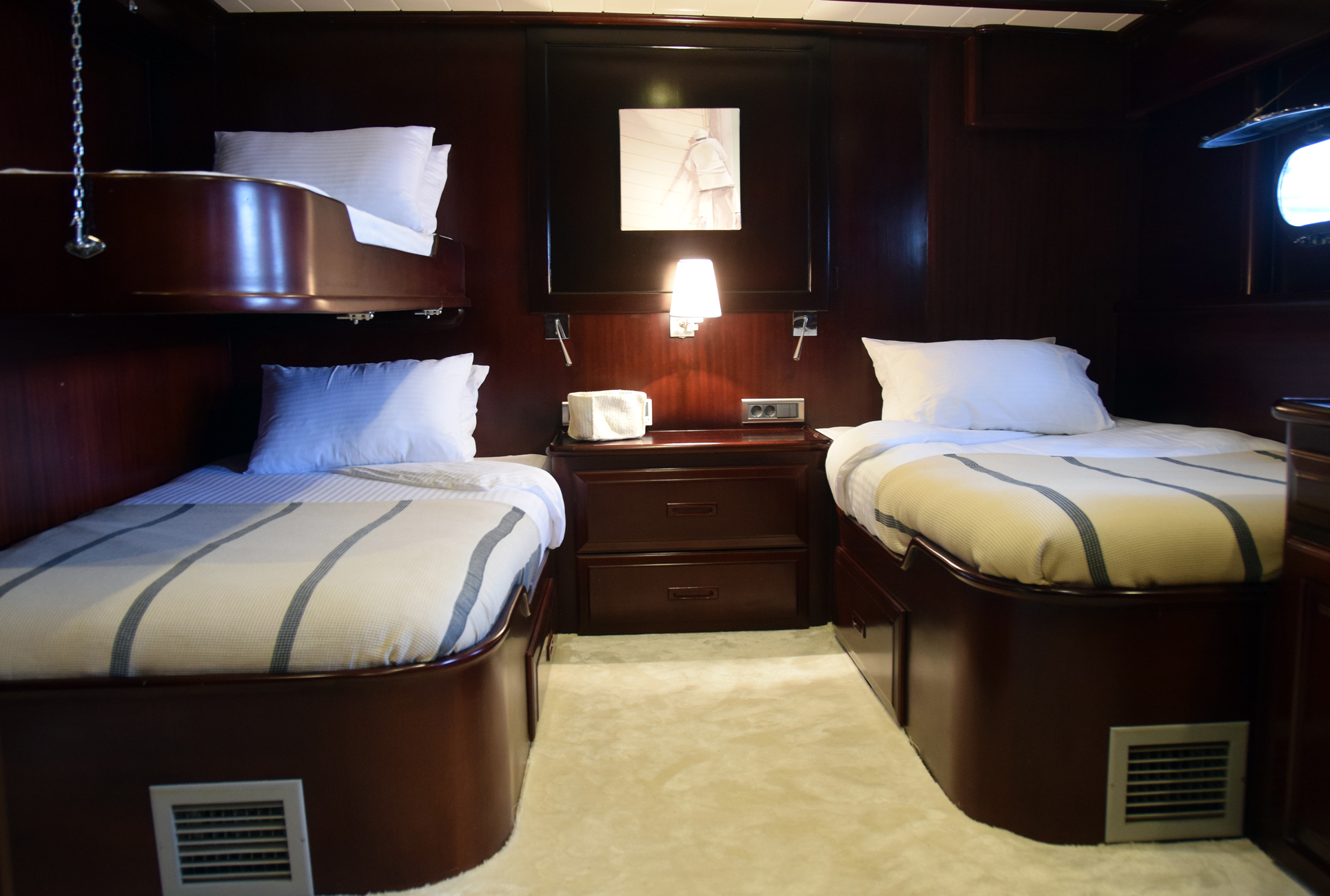 Up to twelve guests can be accommodated in five suites including three doubles and two triples, plus additional cabins for five crew members.