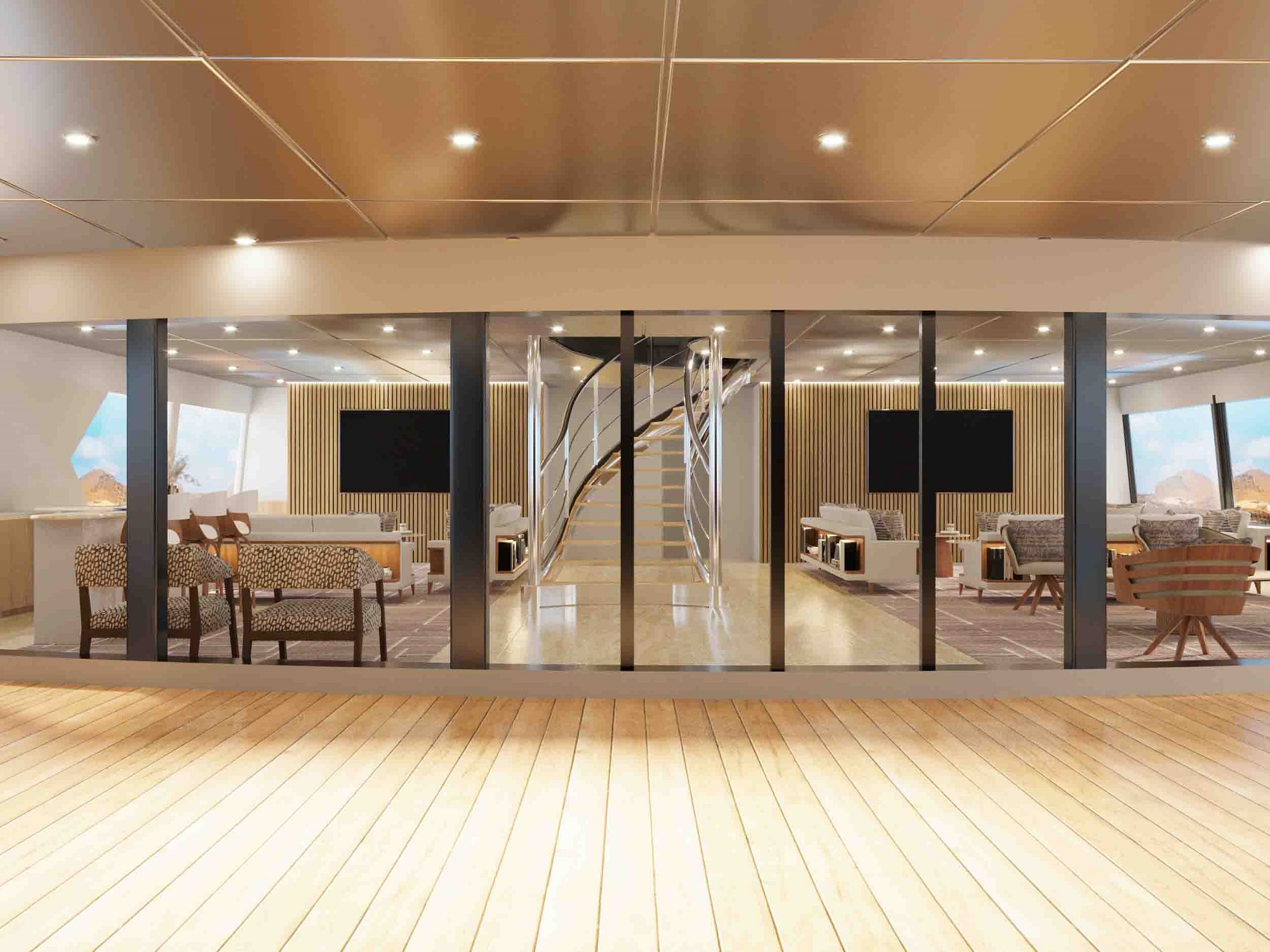 The upper deck dining room is a lovely airy space for guests to enjoy meals inside if the weather makes it necessary. The panoramic/bridge deck offers a semi-open sit up bar and crew service area to enable seamless guest service. Forward on the bridge deck is the crew accommodation and hi-tech wheelhouse.