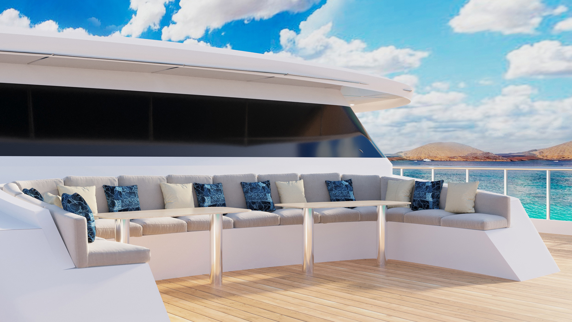 The upper deck is configured with sofas and coffee tables perfect for morning coffee or an evening cocktail.