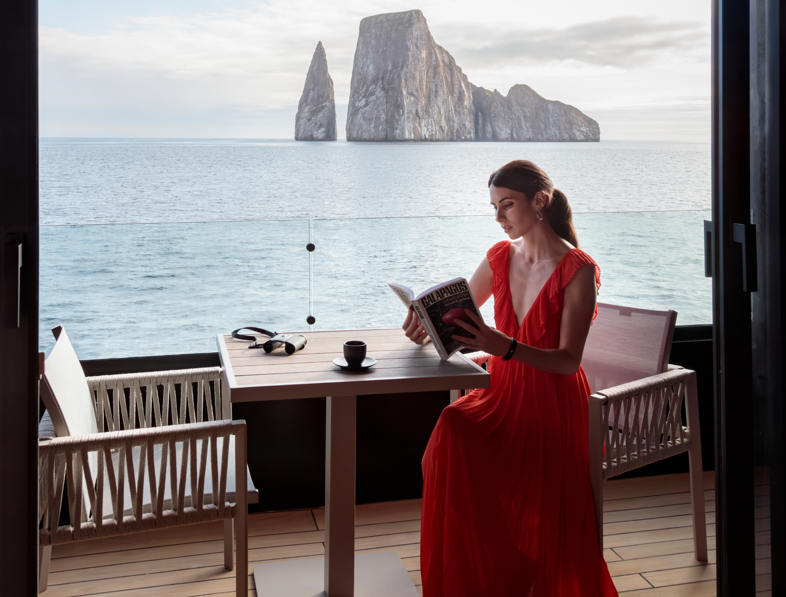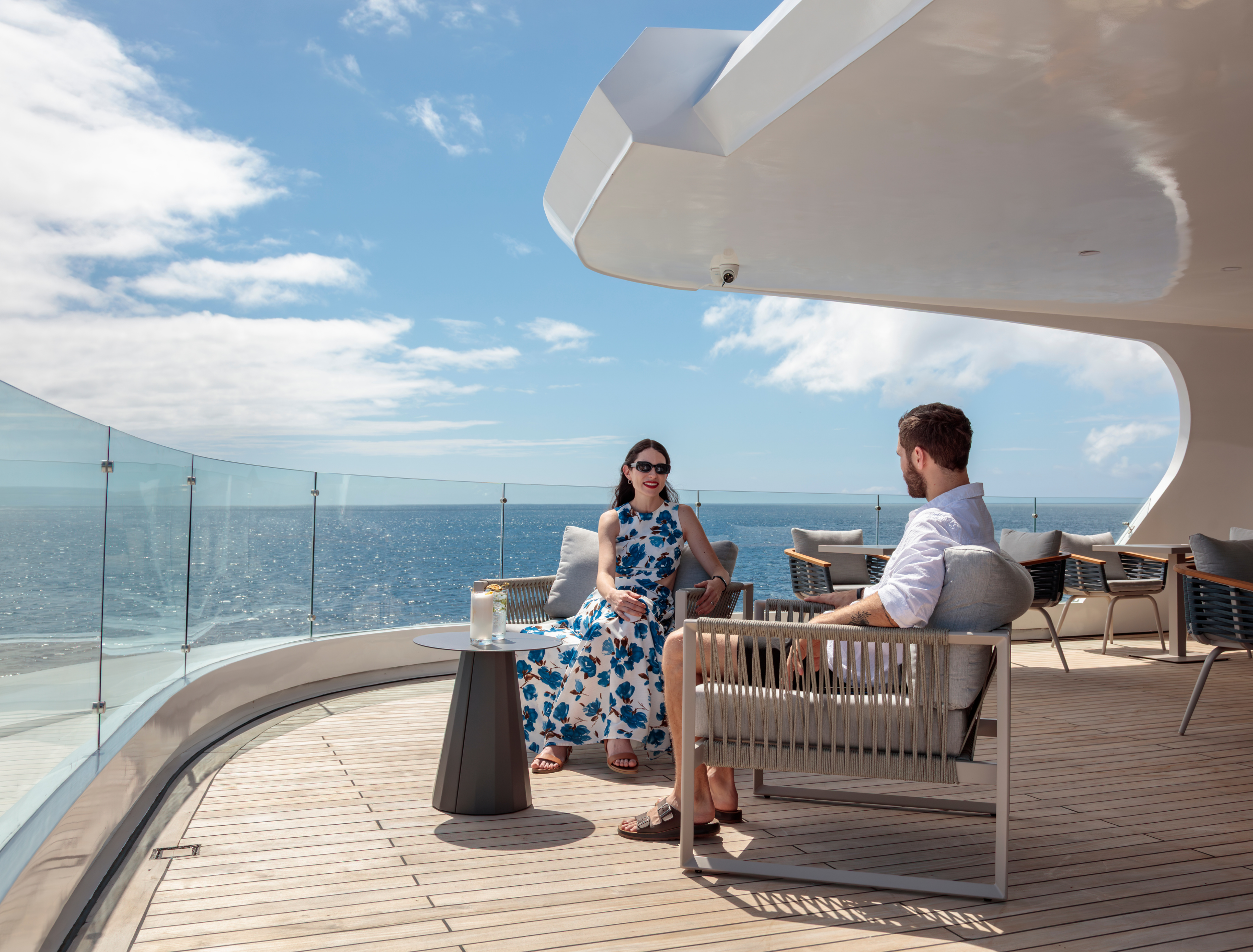The upper deck is configured with sofas and coffee tables perfect for morning coffee or an evening cocktail. The lower deck offers yet more relaxing seating where guests can unwind before heading down to the water’s edge platforms to join the tenders for an excursion up close to the wildlife.
