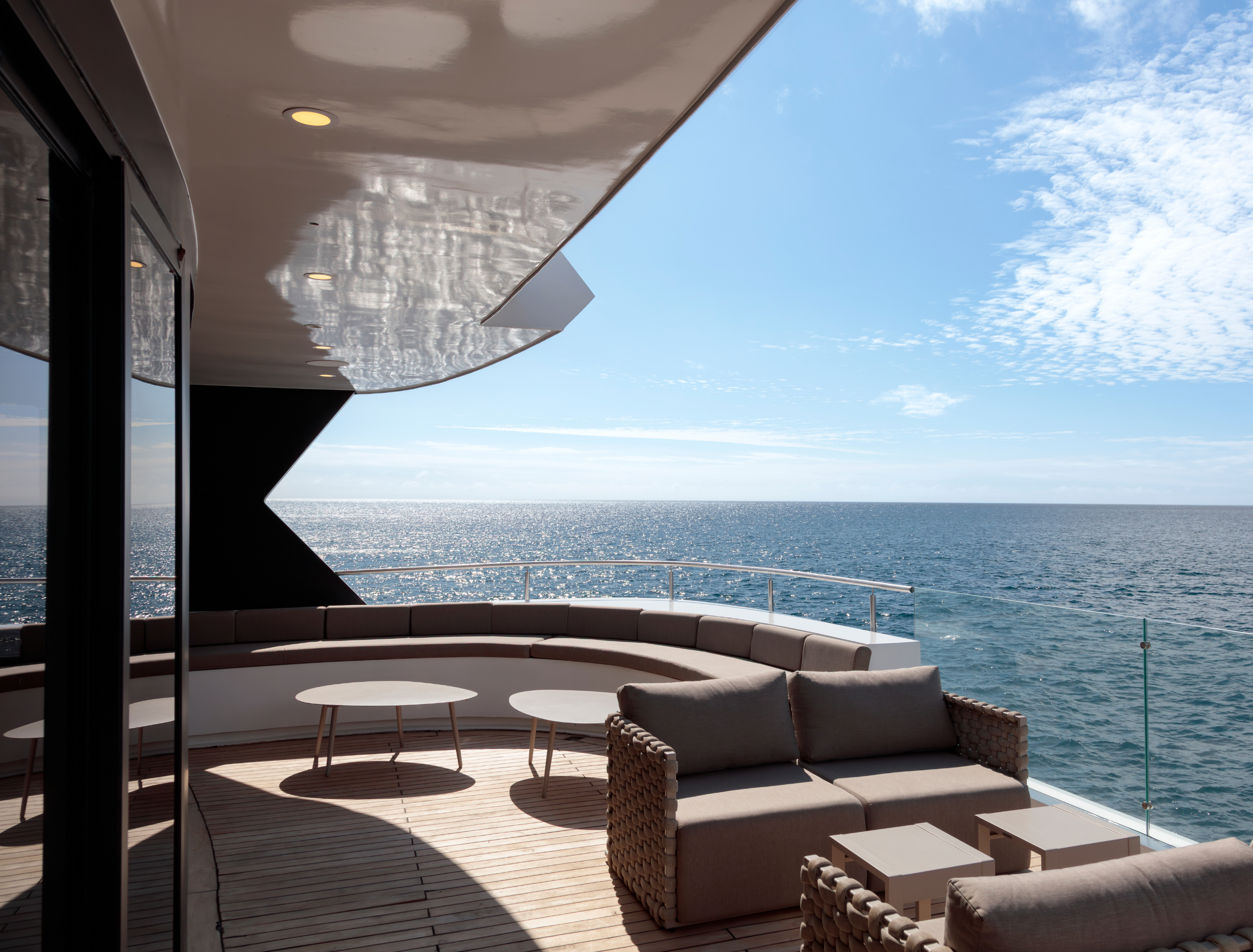 Aft on the main deck is a full beam lounge and bar capable of hosting all the guests on board. Forward on this level is a cosy library and full spa with hammam, sauna and treatment rooms.