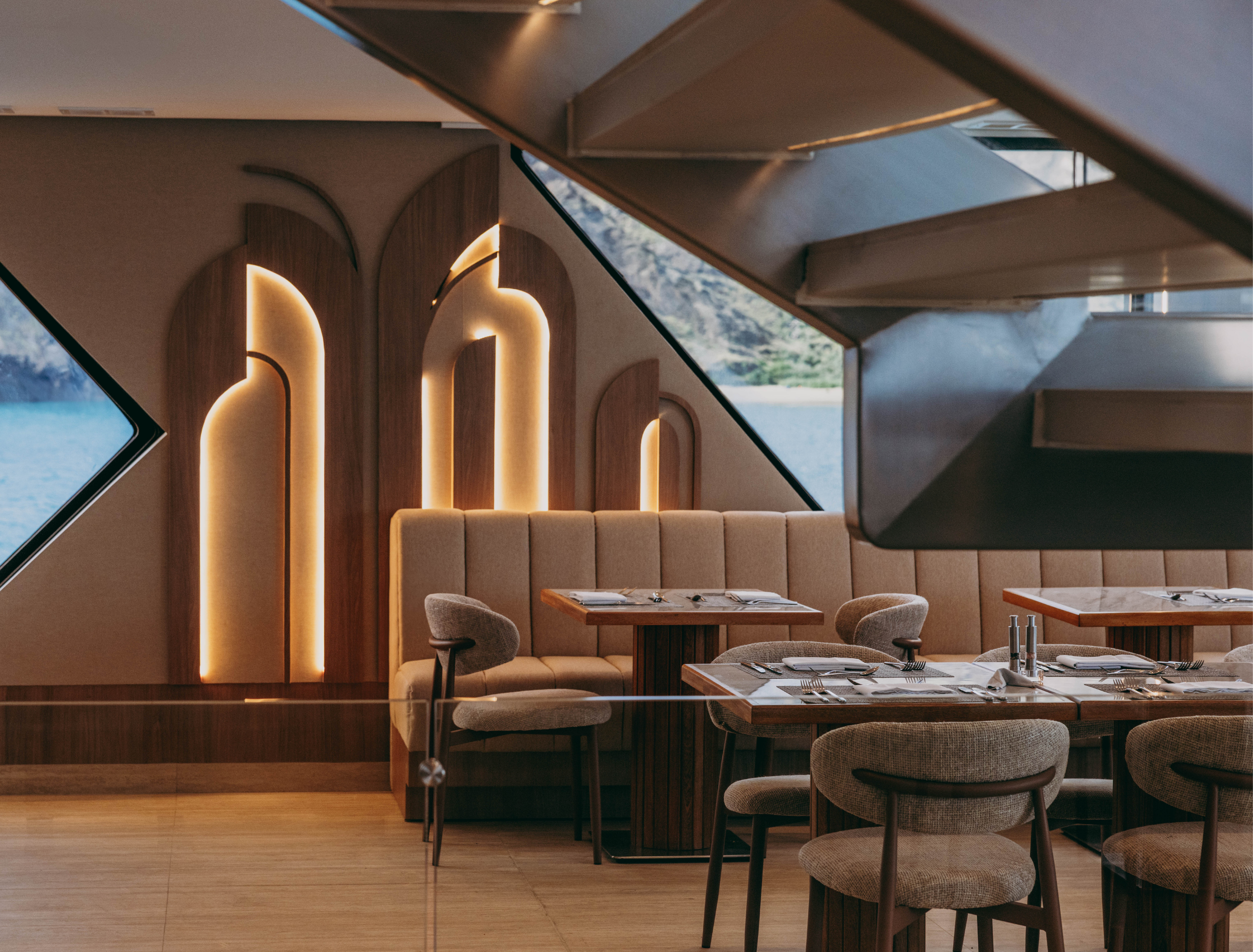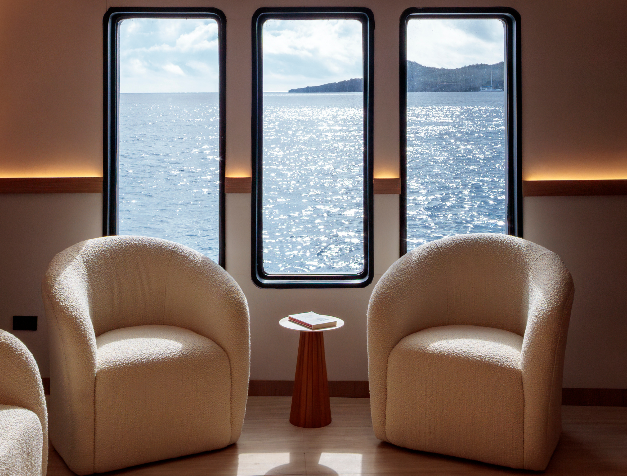 The panoramic/bridge deck is dedicated to al fresco dining with tables and chairs which can be arranged flexibly. This level also offers a large seating area on the foredeck and two wide side decks where guests can view any wildlife sightings.