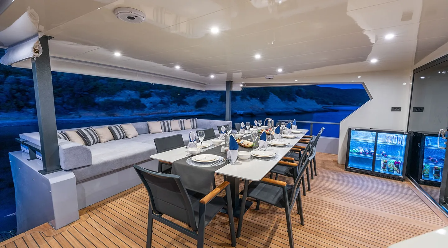 Across the upper and main deck the exterior spaces are spacious and well-equipped to offer comfortable al fresco zones for dining, sunbathing and relaxing.