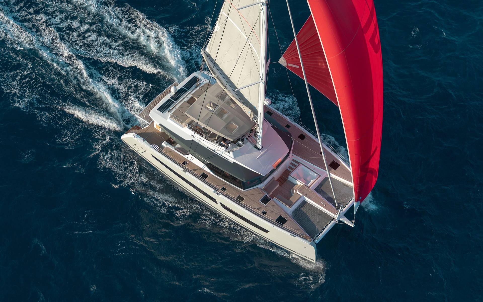 Sailing catamaran LIQUID SKY is a fully crewed charter yacht built by Fountaine Pajot as a 20.44m (67’) Alegria 67 with accommodation for up to eight guests in four suites. Guests can enjoy an idyllic sailing adventure while relaxing on the luxurious deck furnishings and interior salon.