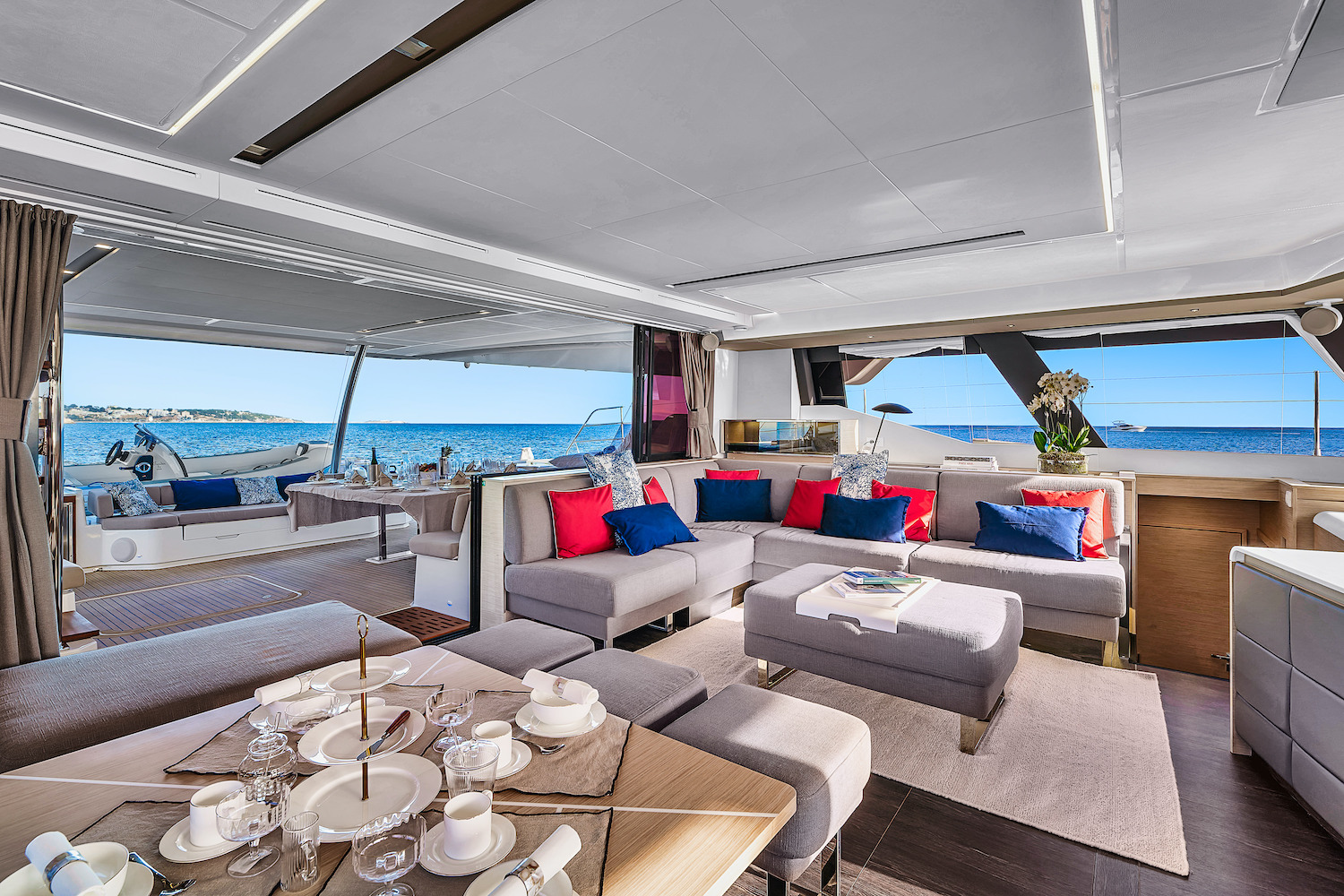 The contemporary interior makes use of blonde wood finishes, plenty of glass and neutral soft furnishings to create light spaces where guests can relax and remain connected with the exterior. Doors aft and forward in the main salon give convenient access around the yacht, perfect for family groups.