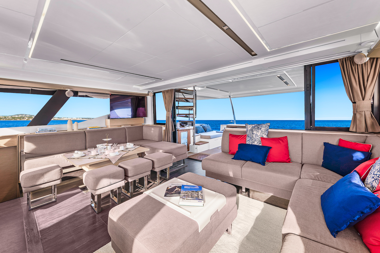 The contemporary interior makes use of blonde wood finishes, plenty of glass and neutral soft furnishings to create light spaces where guests can relax and remain connected with the exterior. Doors aft and forward in the main salon give convenient access around the yacht, perfect for family groups.