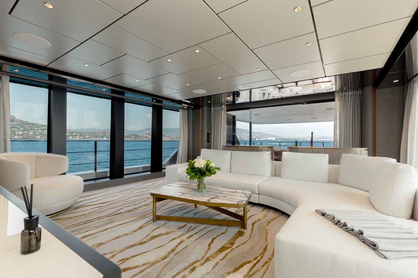 With three exterior deck levels she offers 398 GT of volume and is powered by twin MTU engines which deliver a top speed of 21 knots and a range of 700 nautical miles at her cruising speed of 18 knots.