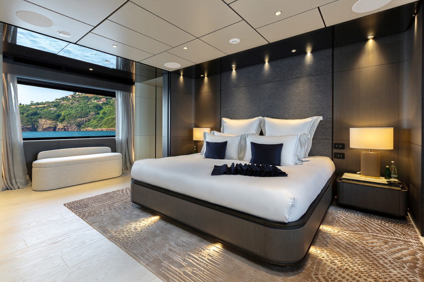 With three exterior deck levels she offers 398 GT of volume and is powered by twin MTU engines which deliver a top speed of 21 knots and a range of 700 nautical miles at her cruising speed of 18 knots.