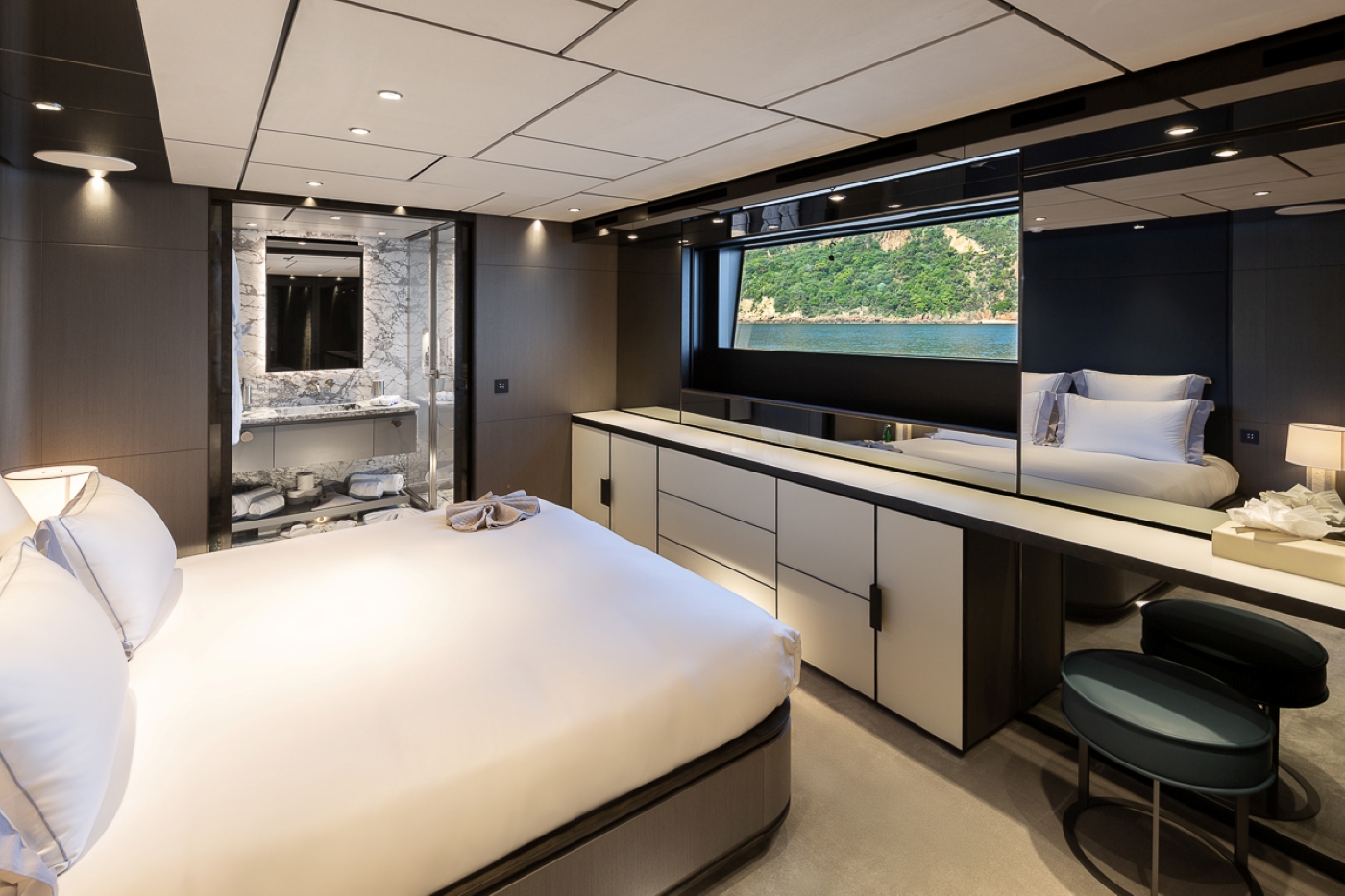 She can accommodate up to ten guests in five suites with additional cabins for seven crew members.