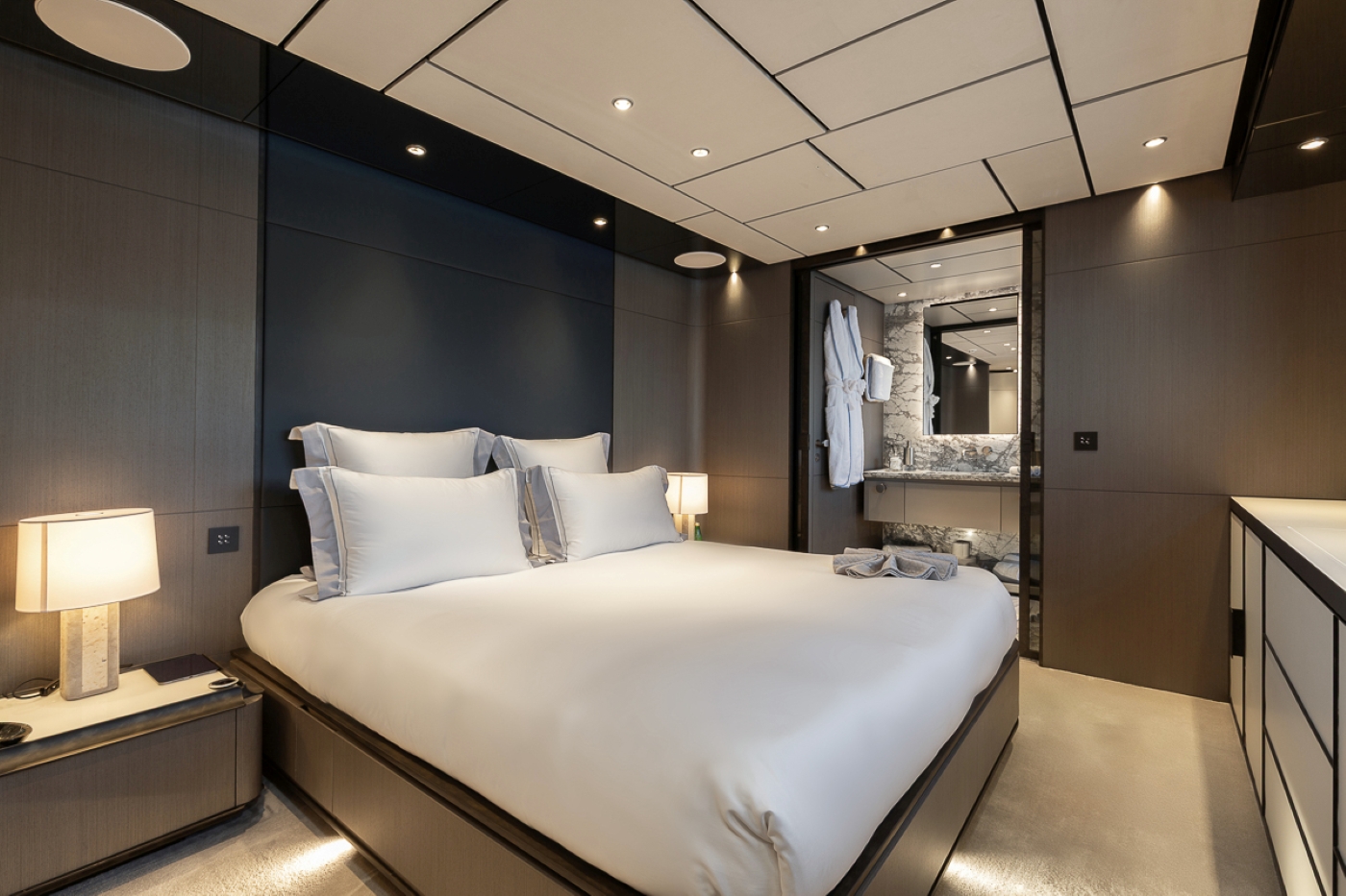 She can accommodate up to ten guests in five suites with additional cabins for seven crew members.