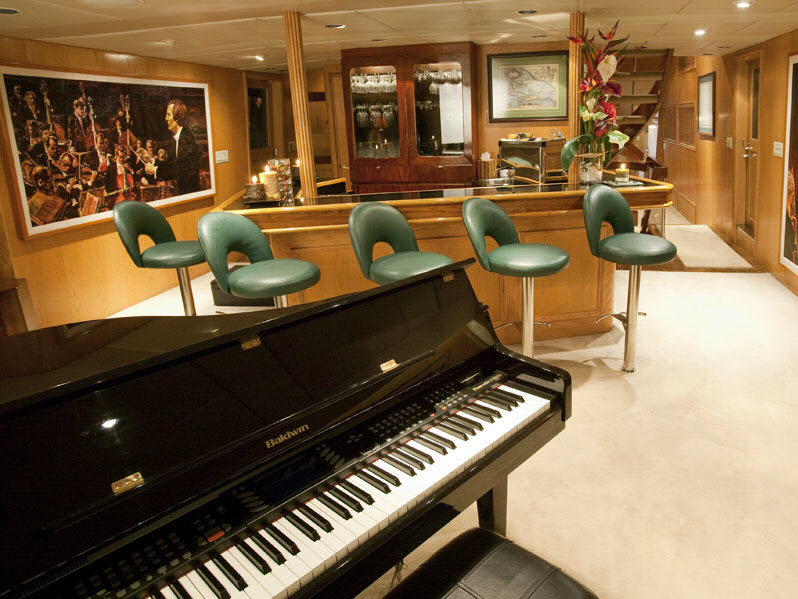 Le Montrachet has a huge Main Saloon with a large L shape bar with 5 stools. Two large TV's with DVD entertain 4 sofas, 2 easy chairs and 2 game tables. There is also a Baby Grand Player piano for those with a love of music. Forward of the main saloon is the open and spacious formal dinning area with seating for 12 guests.