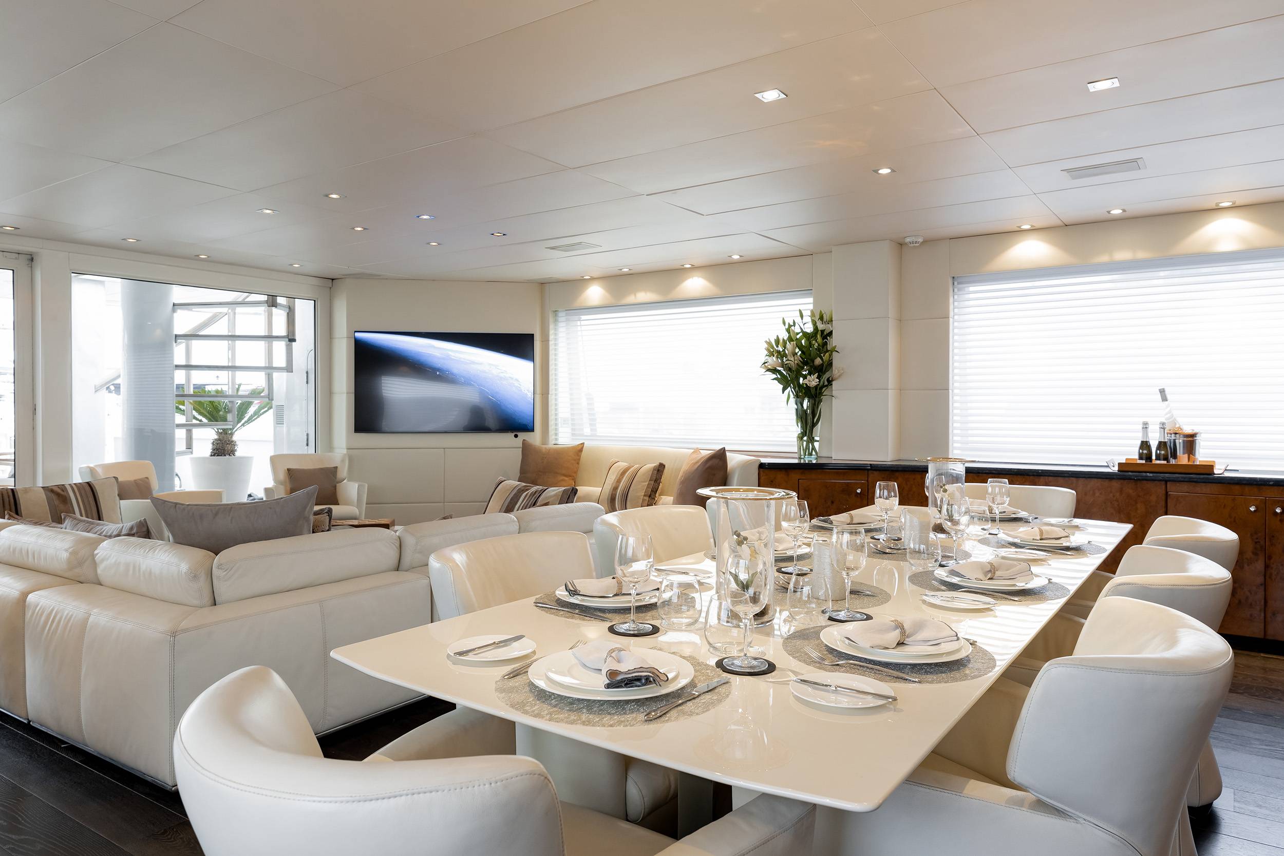 The decks are fitted with lovely contemporary furniture with a generous dining setting, fitted sofas, a bar and lounge on the sun deck. The main deck aft hosts an additional dining setting with a curved settee and other lose furniture surrounding the table.