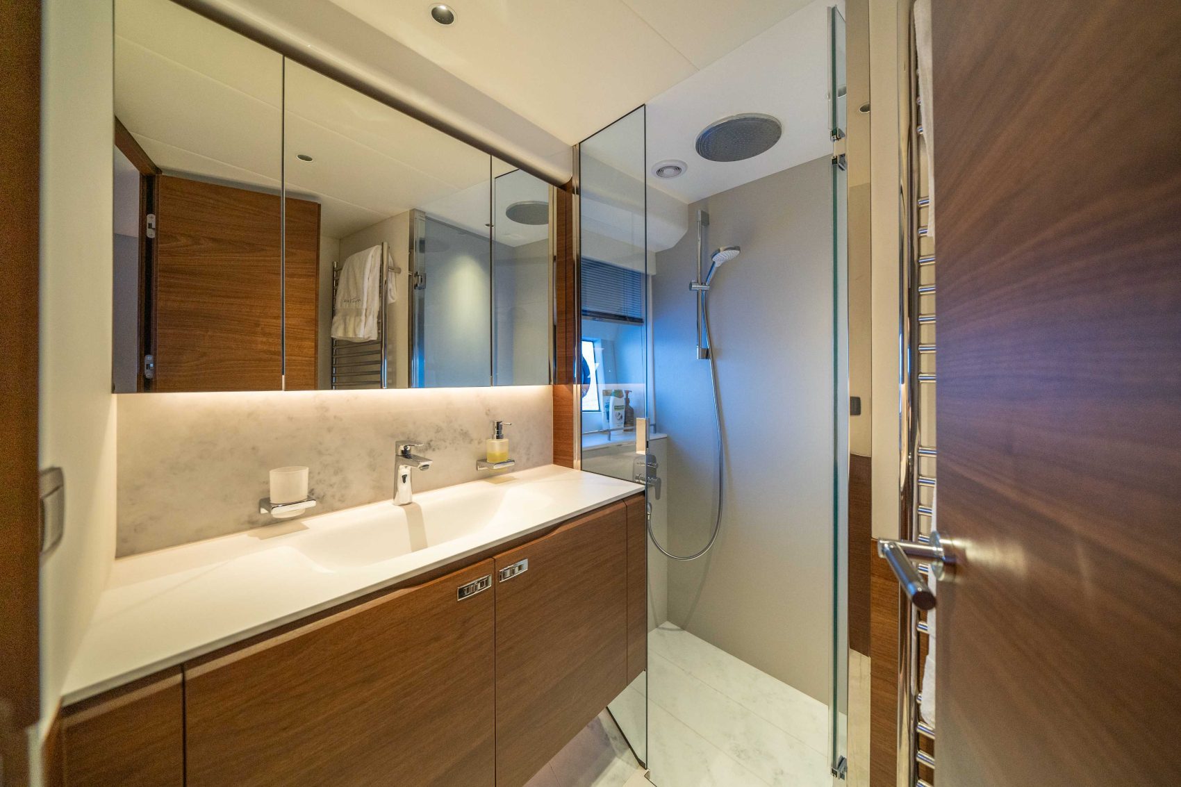 The full beam master has a deluxe ensuite and is positioned amidships, the VIP is forward, again with its own ensuite, while the two twins share a bathroom. Decorated with warm wood finishes and comfortable soft furnishings, the suites are a home from home for guests during their charter.