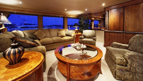 Her spacious Main Saloon has a beautifully tailored L-shaped couch and 2 matching barrel chairs that provide easy access to the full entertainment amoire separating the dining and living areas of the salon.