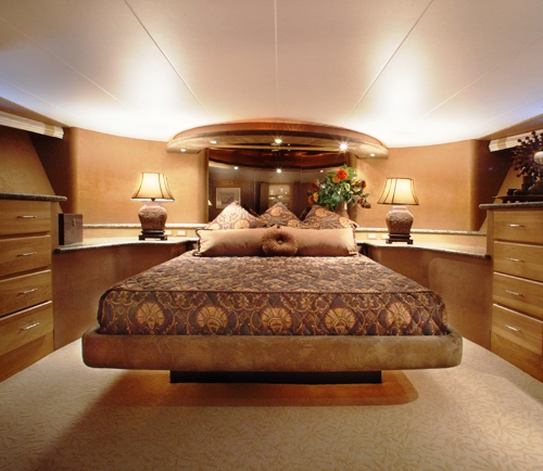 . The Master stateroom with King bed is located all the way forward on the main deck and boasts a 3-seat settee. The En-suite has double sinks and heads along with a with Spa Pool tub and separate double headed shower. Entertainment center features include a flat screen TV/DVD/VCR/CD AM-FM Stereo.