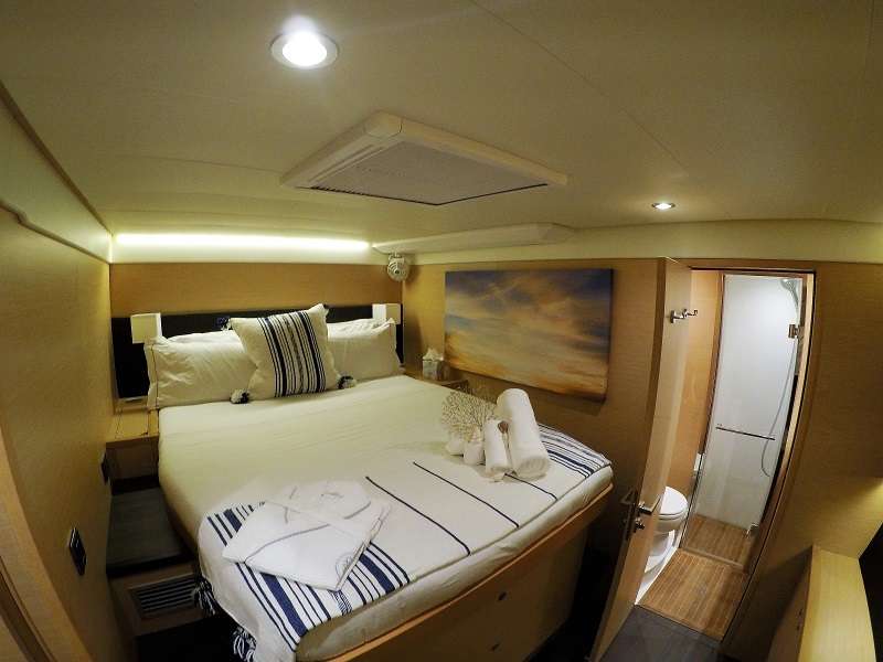 A wide beam and shallow draft create impressive volumes and the ability to anchor in any bay, while the al fresco deck spaces are perfectly configured to make the most of the surroundings. Up to six guests can be accommodated in three luxury suites and there are three crew members on board.
