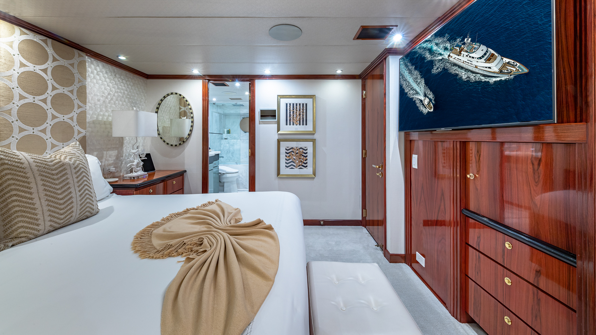 A 55” flat screen TV and a BOSE lifestyle system are sure to keep guests entertained. Her elegant dining room, forward of the main saloon can comfortably seat twelve guests.