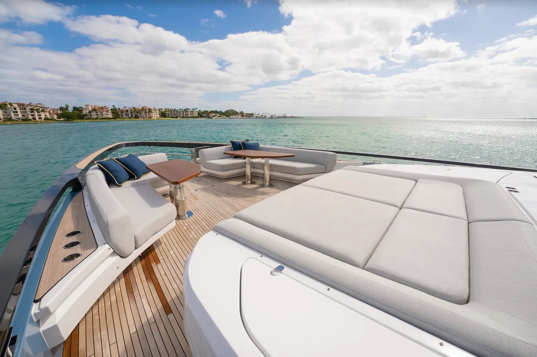 NOTABLE FEATURES OF LATITUDE: ~Hard roof over the sun deck ~Open aft cockpit ~Cool, ice blue hull ~38 knot top speed ~Tender and toys ~Air conditioning ~WiFi